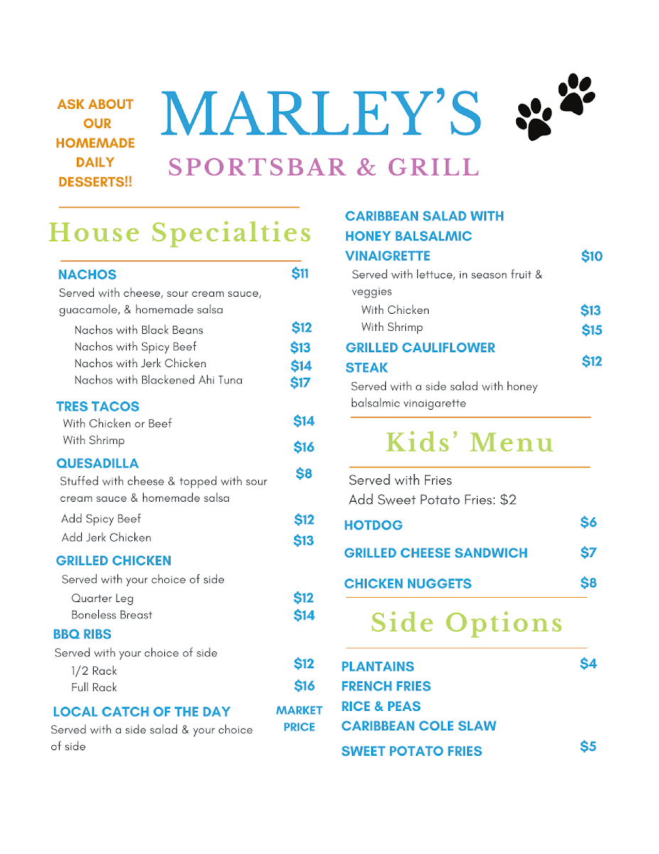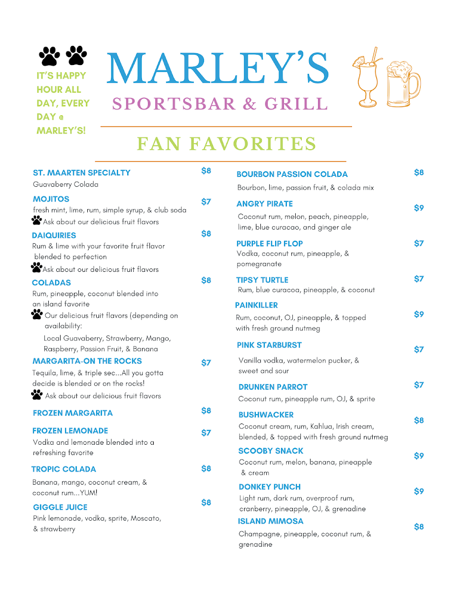 At Marley's Sports Bar & Grill, the menu reflects the easygoing, beachside vibe of Philipsburg. You’ll find a collection of casual bites and comforting drinks designed to match a relaxing day by the sea or a lively evening with friends. The menu offers familiar favorites like jerk chicken nachos, fresh seafood, and crispy wings—perfect for sharing or savoring while watching the game or enjoying the island breeze.